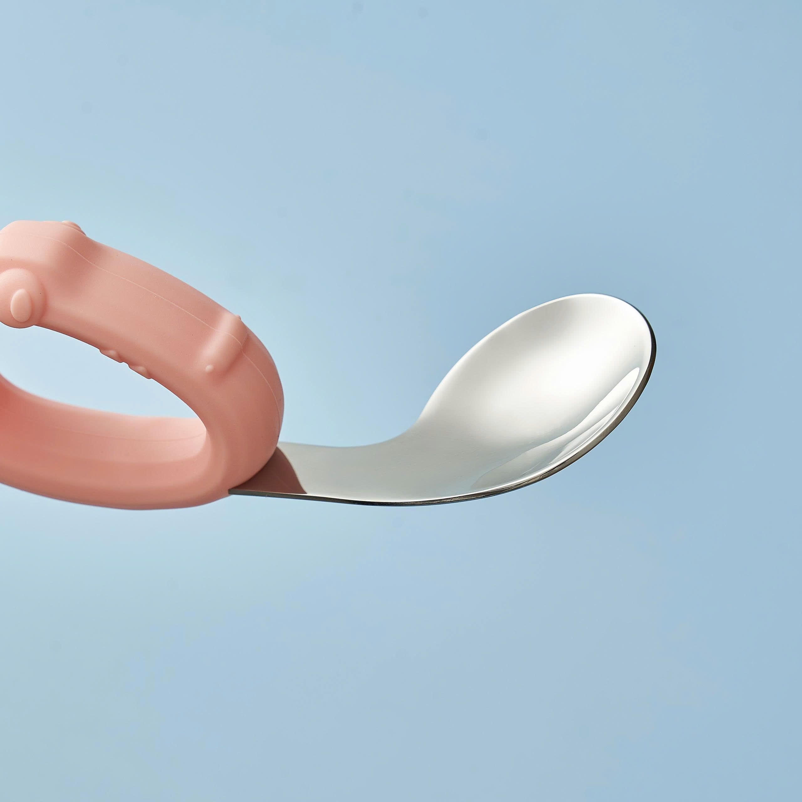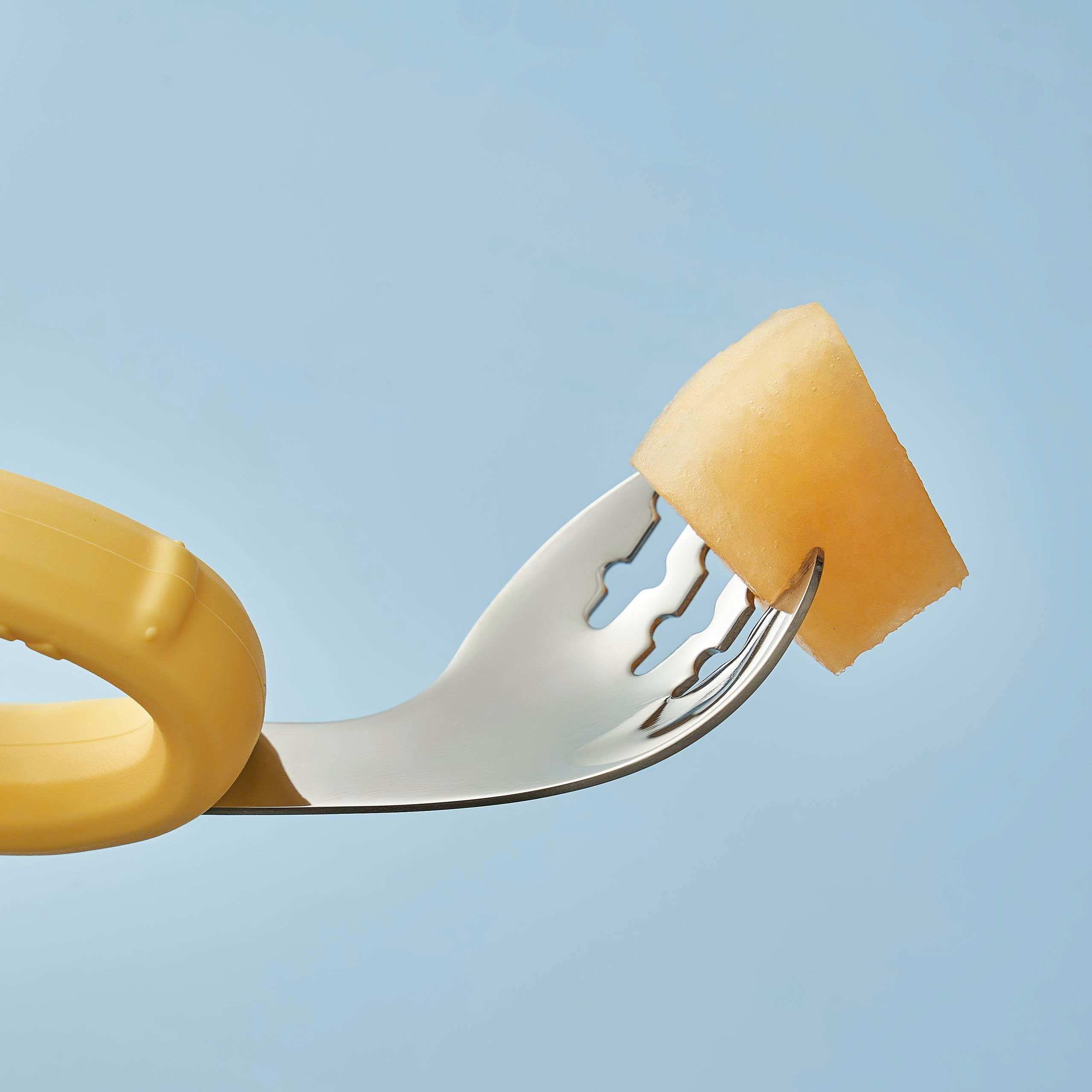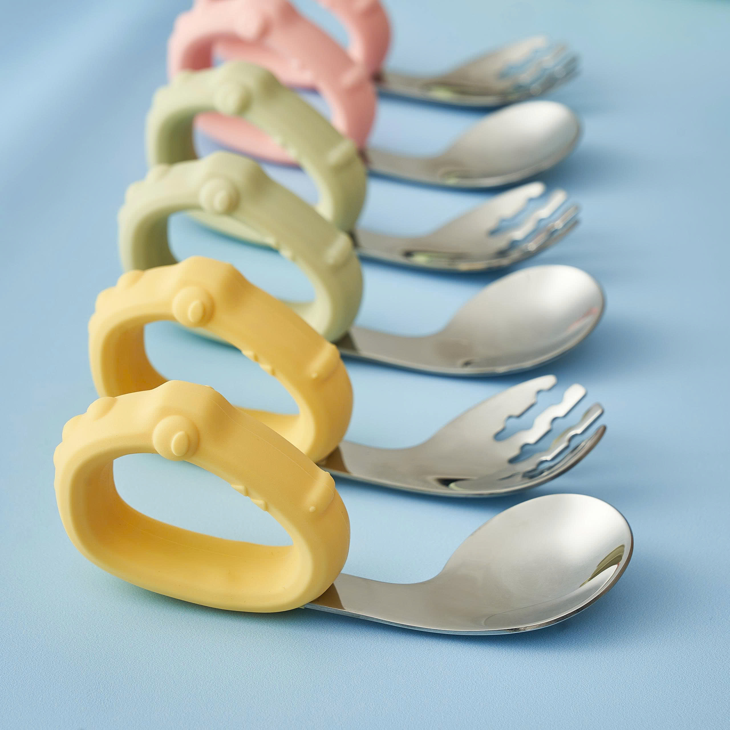 Lưỡi thìa và nĩa được làm từ thép không gỉ cao cấp, an toàn tuyệt đối cho sức khỏe, hạn chế tối đa tình trạng gỉ sét. Tay cầm silicone mềm mại, thân thiện với da bé, hỗ trợ phát triển khả năng cầm nắm và phối hợp vận động tinh.